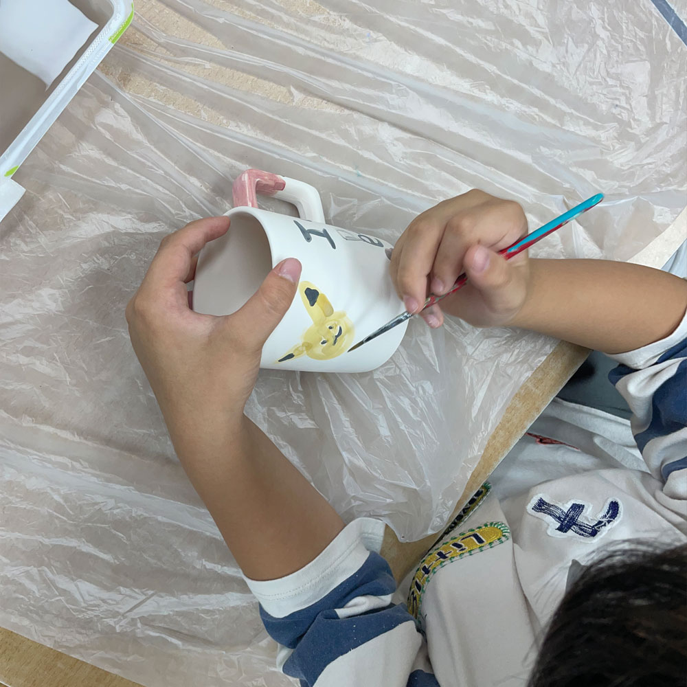 ➀ 초벌구이 된 도자기에 도자기 전용물감을 사용하여 그림을 그린 후